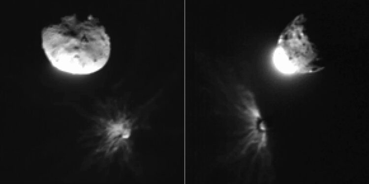New analyses of LICIACube’s close-up images taken minutes after NASA’s DART impact on the asteroid moonlet Dimorphos show that the expanding ejecta plume provided a significant “recoil” that amplified the asteroid’s deflection beyond the direct push of the spacecraft alone. These observations are helping refine models of impact physics and strengthen future planetary defense strategies.