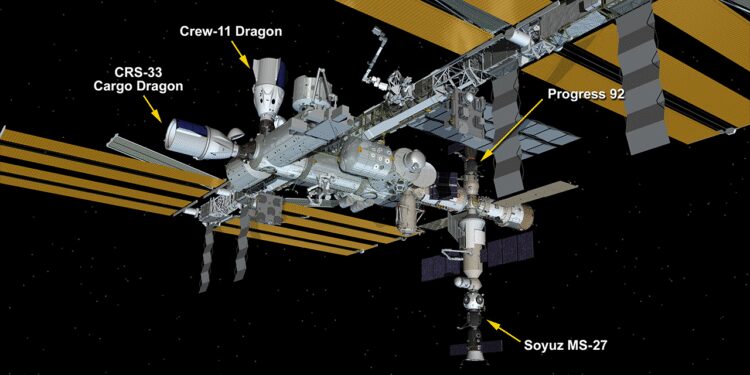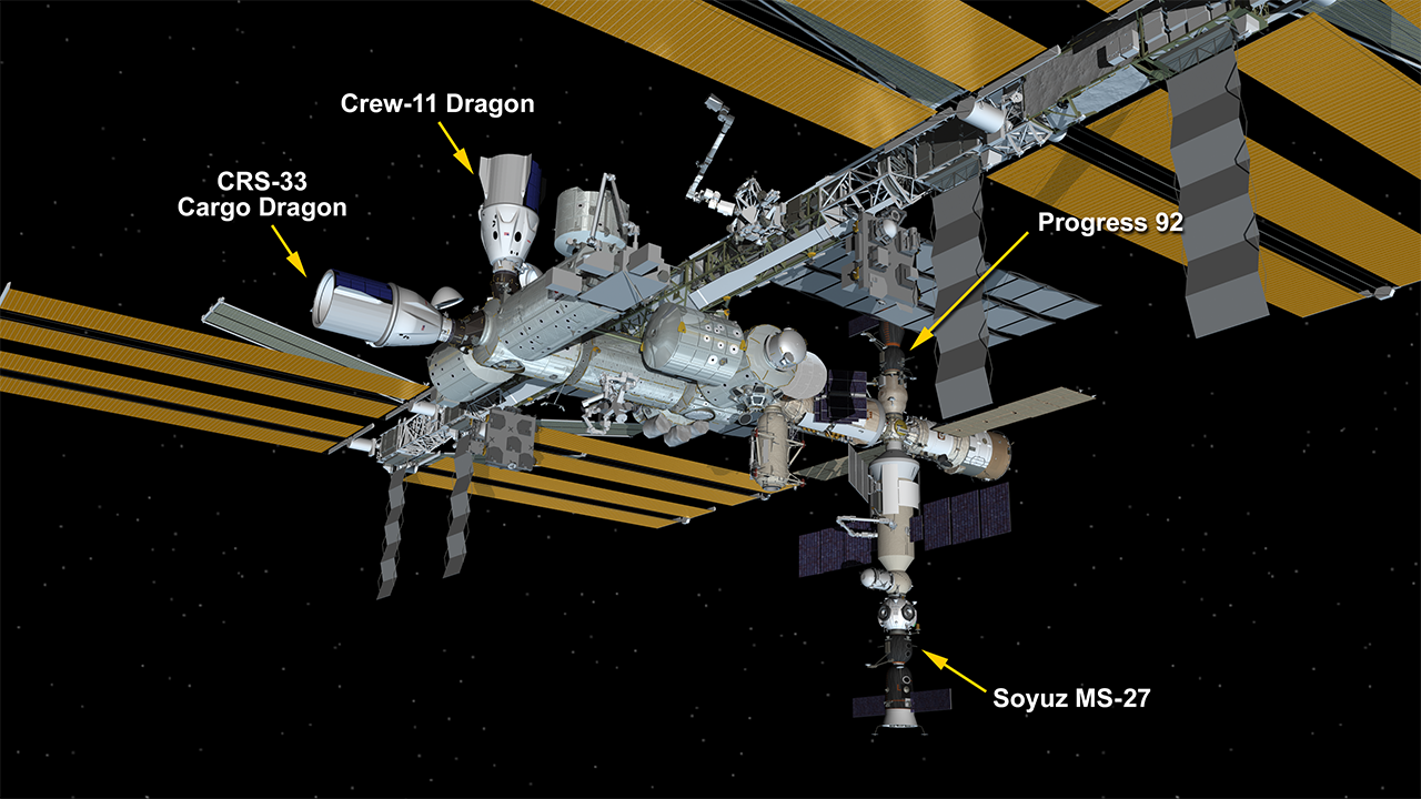 With Progress 91 departed, the Zvezda aft port is now available for future visiting vehicles and station traffic management. At the time of undocking, the station remained served by four docked spacecraft: a SpaceX Dragon cargo craft, the SpaceX Crew-11 Dragon spacecraft, the Soyuz MS-27 crew ship, and the Progress 92 resupply ship.